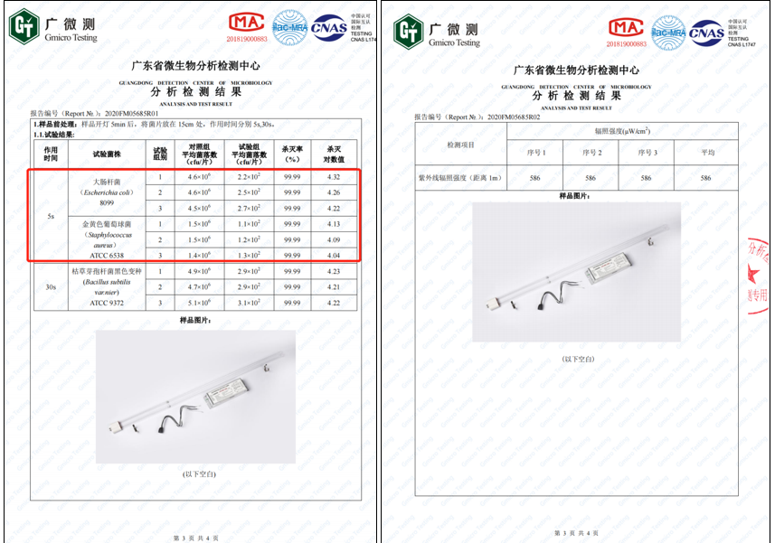 紫外光源第三方檢測報告:(輻照強(qiáng)度+殺菌率)